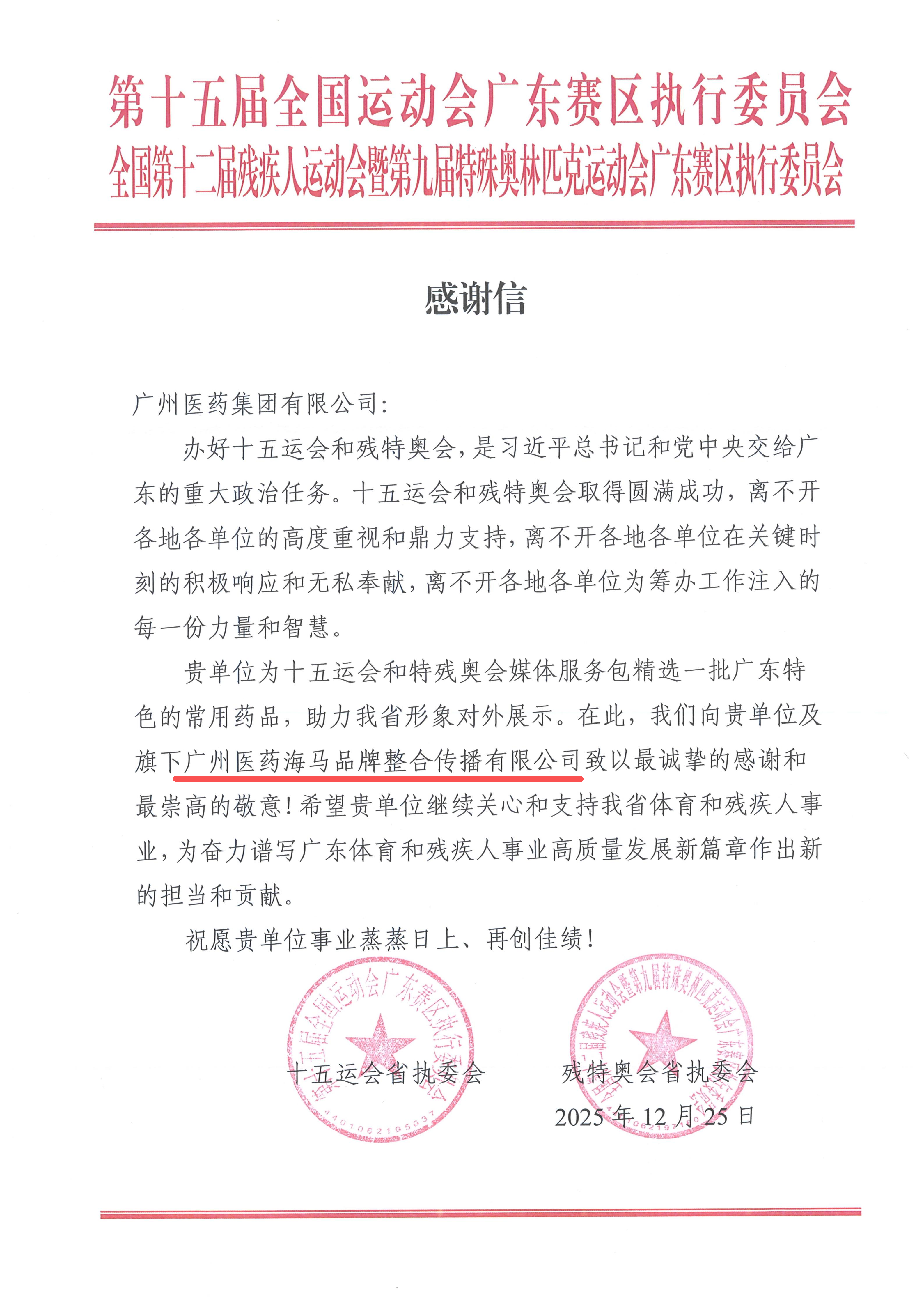 近日,一封格外温暖的感谢信被送到广药集团,信是从中华人民共和国第十五届全国运动会广东赛区执行委员会、第十二届残特奥会广东赛区执行委员会联合发来的。信中对广药集团及旗下广州医药海马品牌整合传播有限公司(以下简称“海马公司”)为赛事媒体服务包精选广东特色常用药品、助力广东形象对外展示表示诚挚感谢与崇高敬意。这份权威的肯定,是对广药集团和海马公司专业能力、责任担当与匠心服务的高度认可,更是激励公司深耕文创赋能、践行社会责任的强大动力。