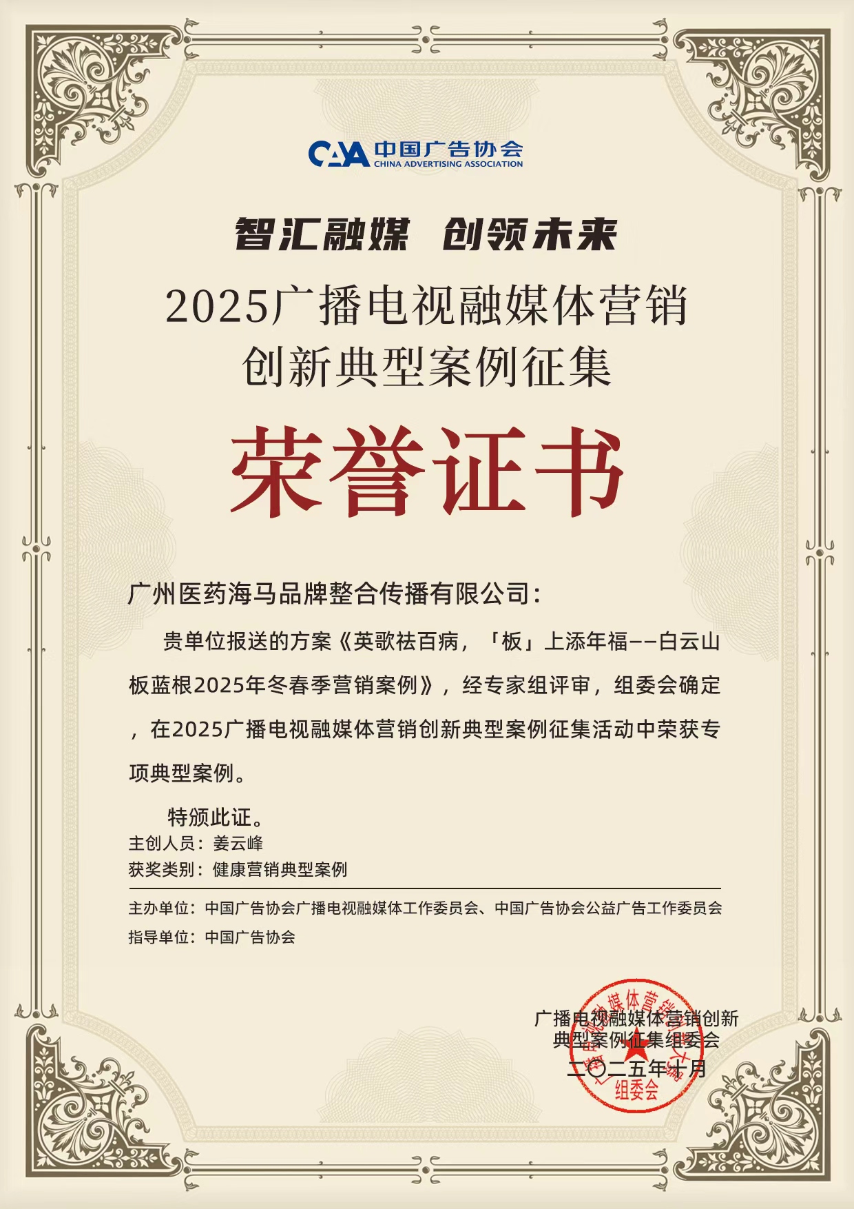 近日,在第九届广州4A品牌干货大会上,由海马公司提供整合传播服务、白云山和黄主办的《英歌驱百病·板上添年福——白云山板蓝根2025年英歌舞整合营销传播》项目,荣获“年度优秀案例奖”。