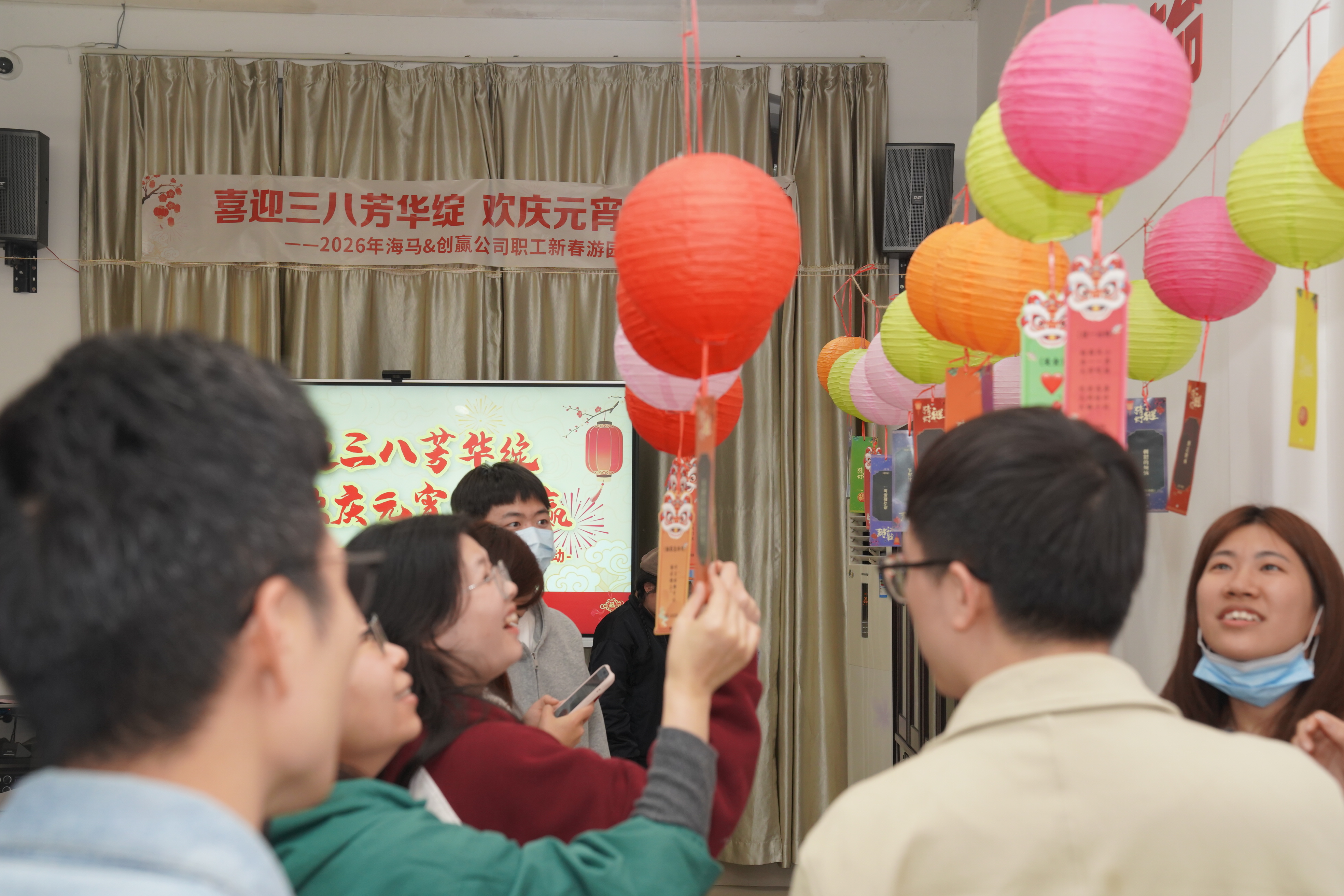 活动现场洋溢着节日的喜庆氛围。五颜六色的灯谜随风摇曳,三五成群的身影围成一圈,有人皱眉思索,有人恍然大悟;旁边的“百步穿杨”“圈乐无穷”“马上同心”等游戏区,欢笑声一阵高过一阵。手作棉花糖、漆扇制作环节也备受青睐,大家纷纷挽起袖子,亲手体验传统手艺的魅力。此外,活动还将安全生产知识和党纪学习内容巧妙地编入游戏,主打一个“让知识以快乐的方式进入你的脑子”。职工们或参与游戏,或围在一起品尝着香甜的汤圆,欢声笑语不断,展现了海马&创赢公司大家庭的温暖与和谐。